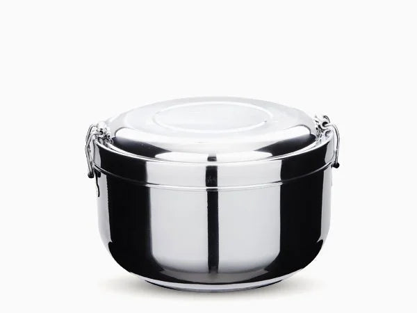inless Steel Food Storage Container Lightweight, durable, double walled, split level stainless steel food storage container. It is ideal for hot or cold lunches, it will keep food warm or cold for hours.