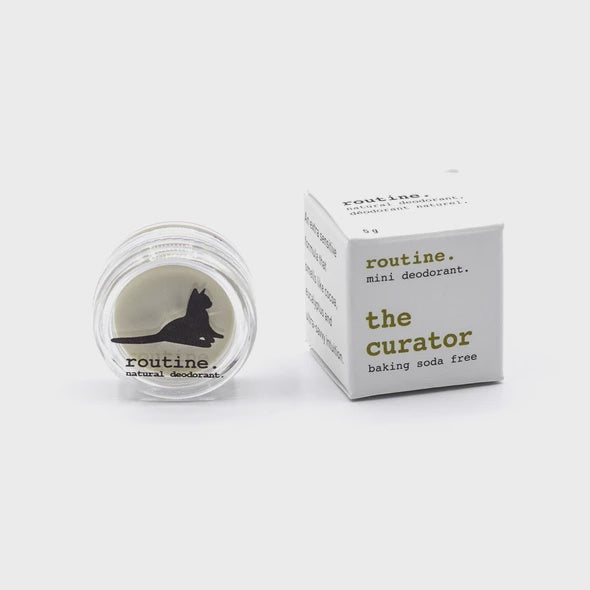 Eucalyptus coco & savvy intuition. Magnesium for underarm nutrition. Baking soda free sure feels nice For sensitive folks like Vanilla ice. Introducing routine's new baking soda free natural deodorant line up! Of course we have to give our good pal baking soda credit. It is an amazing natural product deodorizer and the star of our original well-loved formulas (which are still available of course!) The thing is baking soda is alkaline and for some people at certain times it can throw off their pH balance in turn causing skin sensitivities . This is why for our friends with sensitive skin we have created four new deodorants in which baking soda is replaced with dietary magnesium (The Curator Sexy Sadie Blackberry Betty Johnny's Cash) - a mineral that if you're not getting enough of can cause your sweat to smell worse! As it happens topically magnesium works like a charm and makes our new formula as effective as the original routine. Another benefit of magnesium: it aids in relaxing the armpits which in turn fends off those woeful stress sweats! Did we mention you can use this routine on cuts scrapes and wherever else you need external calming or deodorizing? Amazing! Magnesium is a front-runner in the health and wellness world and we're excited to help you get your daily dose! + + positive! Enough product for 4-7 days in a row. Ingredients: cocos nucifera (coconut) oil magnesium hydroxide kaolin clay zea mays (corn) starch maranta arundinacea (arrowroot) cera alba (beeswax) theobroma cacao (cocoa) seed butter butyrospermum parkii (shea) butter calendula officinalis (marigold) infused olea europaea (olive) oil tocopherol (vitamin e) cetearyl olivate sorbitan olivate brassica glycerides pelargonium roseum asperum (rose geranium) oil eucalyptus globulus leaf (eucalyptus) oil pogostemon cablin (patchouli) oil tsuga canadensis leaf (black spruce) oil rosmarinus officinalis (rosemary) leaf extract.